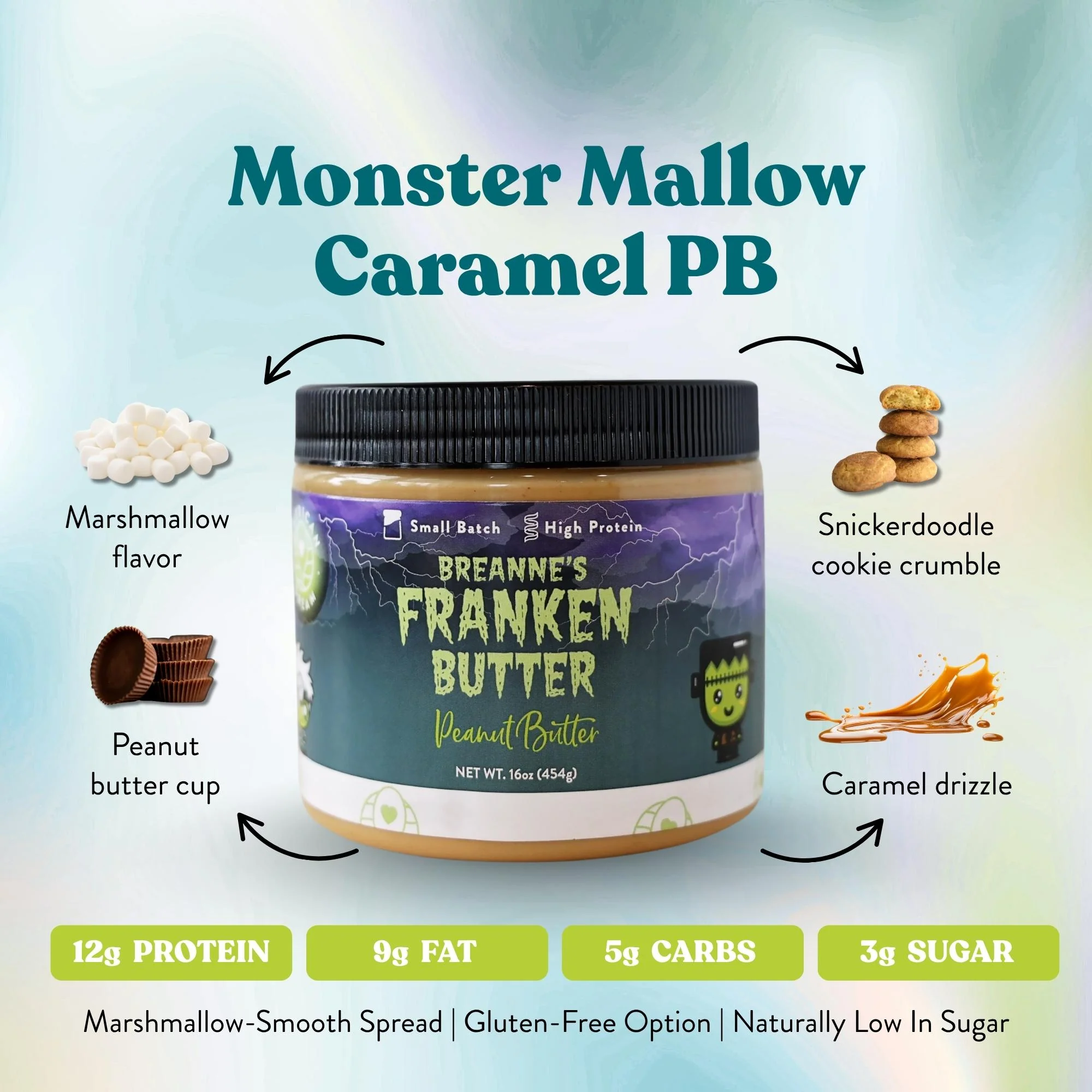 This year’s build starts with our Monster Mallow–flavored peanut butter, stitched with gooey marshmallow madness. On top, you’ll find snickerdoodle cookie chunks, golden caramel drizzle, and a whole peanut butter cup—chaotic, monstrous, and monstrously delicious.