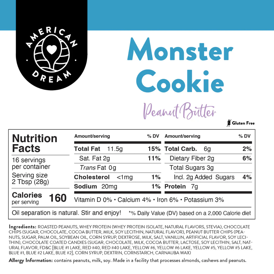 There’s nothing spooky about this monster! Our Monster Cookie Peanut Butter quickly became a fan favorite and landed itself on our permanent menu...any guesses why? This candy-coated blend can be enjoyed any time of the year and even with all of these toppings, it still fits into any diet or lifestyle!  This silky-smooth peanut butter is hand-whipped with rich peanut butter cookie flavor, but we didn't stop there! Each jar is hand-topped with milk chocolate chunks, peanut butter chips, and mini chocolate coated candies.Â