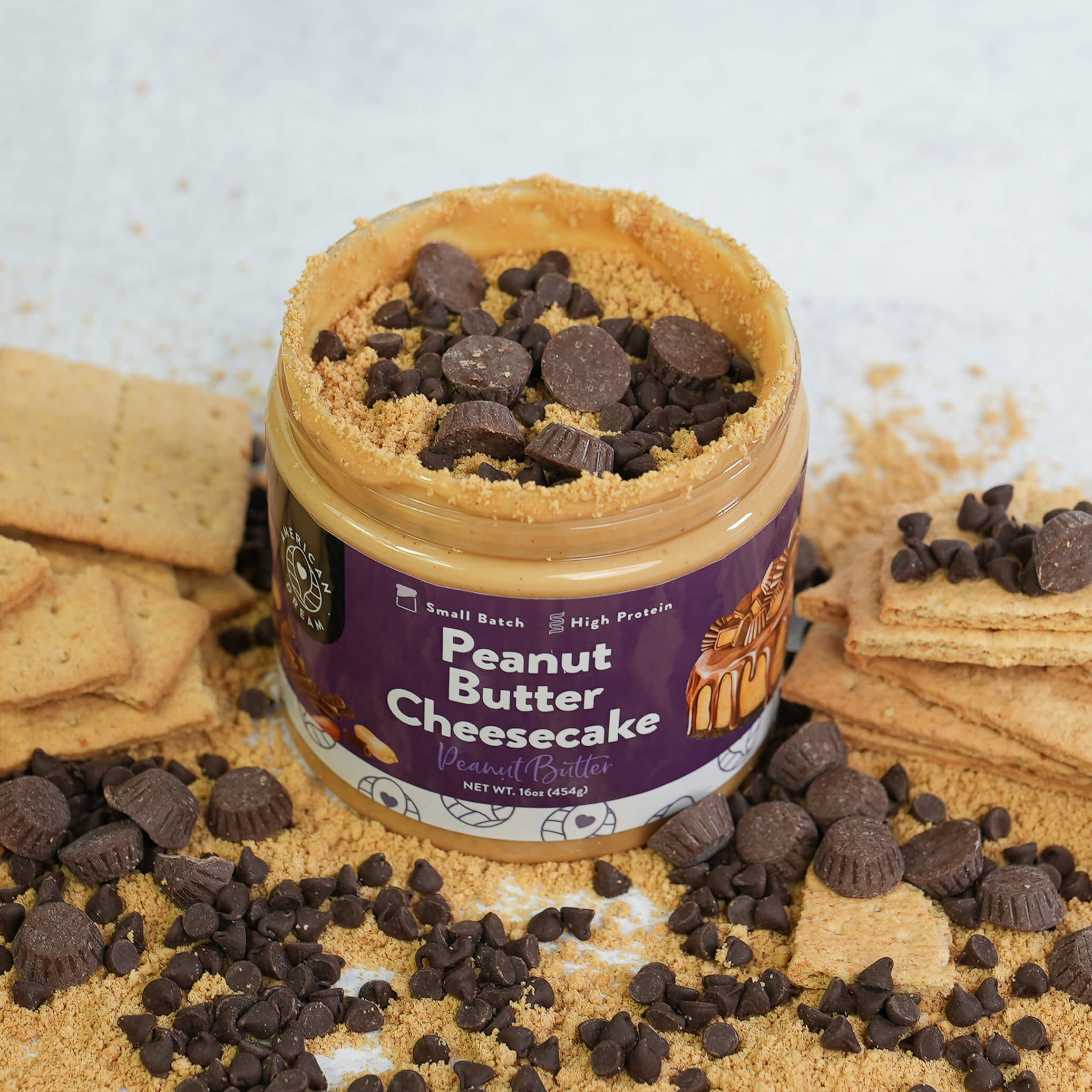 Oh hello there beautiful. Peanut Butter Cheesecake has officially *entered the chat*...and name something MORE crave-worthy, we dare ya! The ultimate decadent dessert sure to cure all your sweet treat hankerings. Peanut butter cheesecake lovers, this blend is all for you! To create our all-new Peanut Butter Cheesecake Peanut Butter, we start with American grown and harvested peanuts, roasting and grinding them to peak perfection. We then delicately flavor our drippy, drizzly peanut butter with the sweet tanginess of the cheesecake! What’s a cheesecake without a bit of texture? We layer ribbons of velvety smooth cheesecake peanut butter atop a crunchy crushed graham crust before toppings with mini or chopped peanut butter cups and mini chocolate chips. Chocolate, nutty extravagance at its finest, this is one jar you won’t want to share!