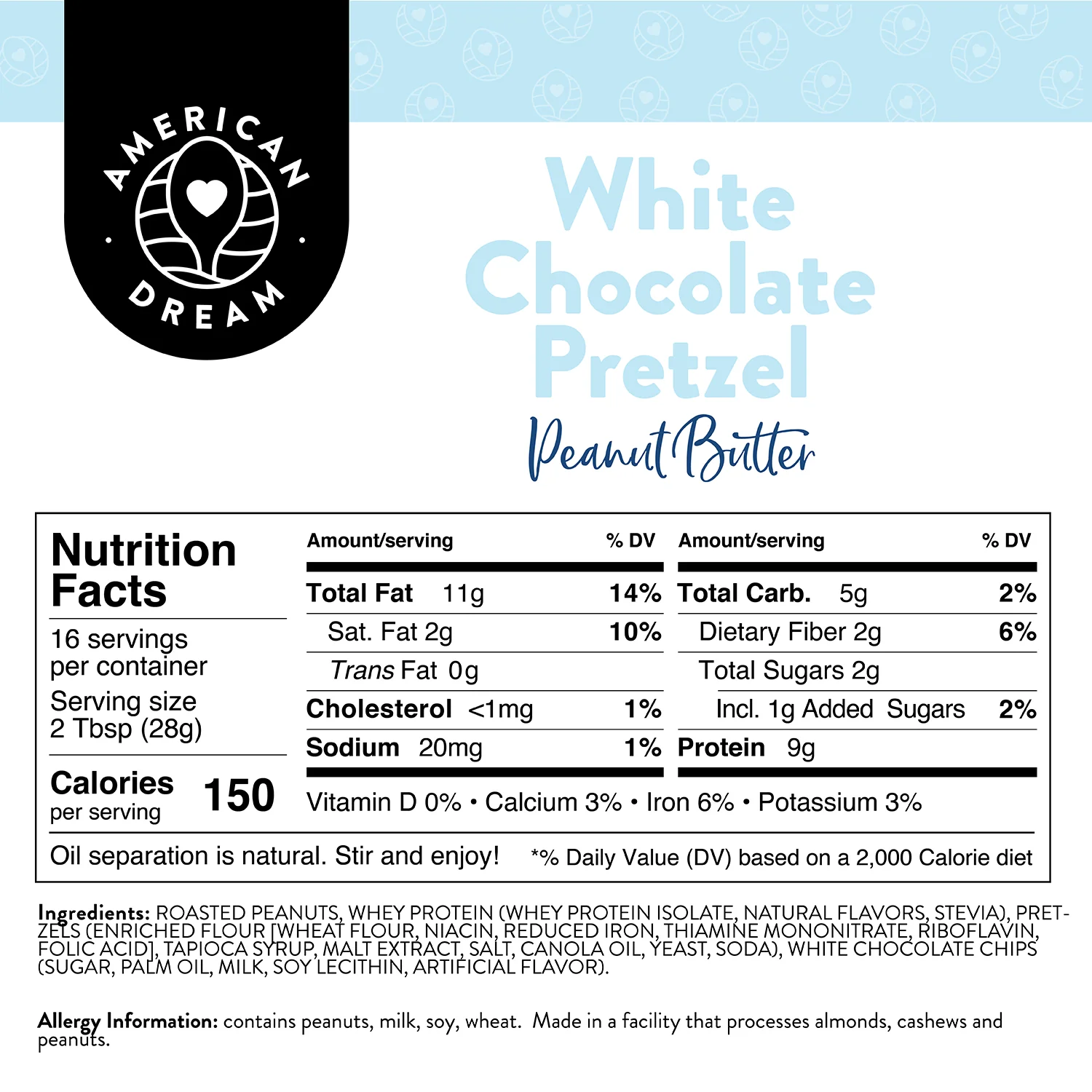 Looking for the perfect combination of salty and sweet? Look no further than our White Chocolate Pretzel Peanut Butter! We’ve combined rich white chocolate with our silky smooth peanut butter resulting in what tastes just like a white chocolate peanut butter cup! Topped with premium white chocolate chips and pretzels, you’ll be able to satisfy all your sweet and salty cravings with just one bite!